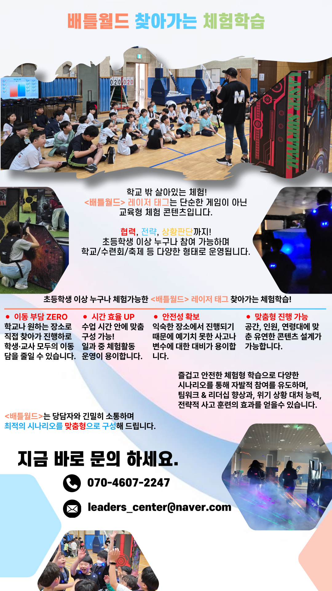 출장 서바이벌 프로그램 학교로 찾아가는 체험학습 찾아가는 워크숍 프로그램 수련원 및 연수원 프로그램 찾아가는 행사 및 축제 프로그램 찾아가는 체험학습 이동이 필요없는 체험학습배틀월드와 함께 하세요!! 경기도 하남시 미사대로 410, 7층 101-739호 070-4607-2247 Blog Instagram Youtube 문의하기 빠른 시일내에 상담 및 견적을 도와드리겠습니다. Name Email Phone Company Message 보내기